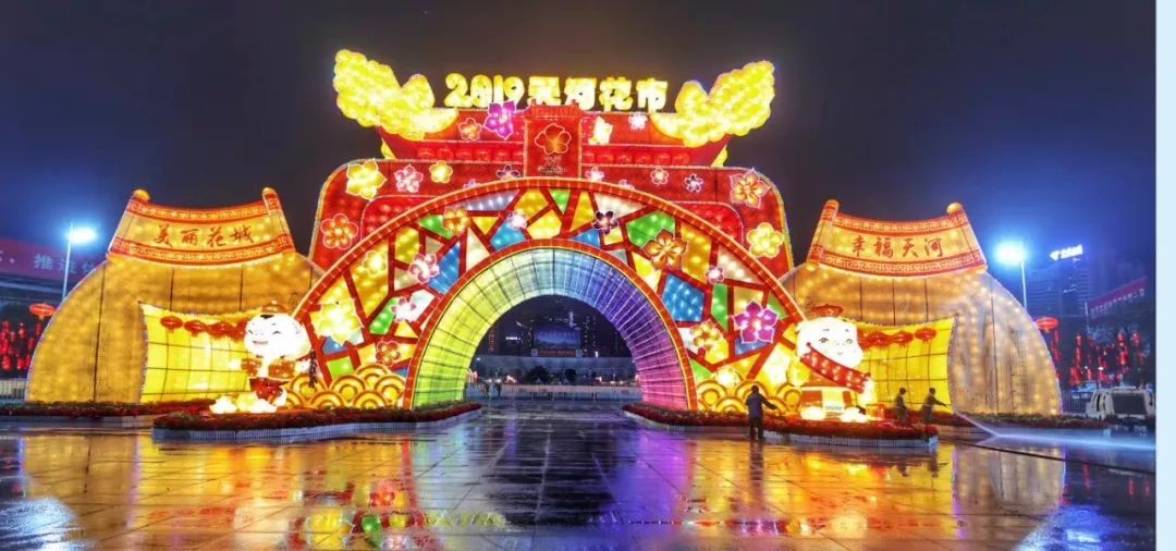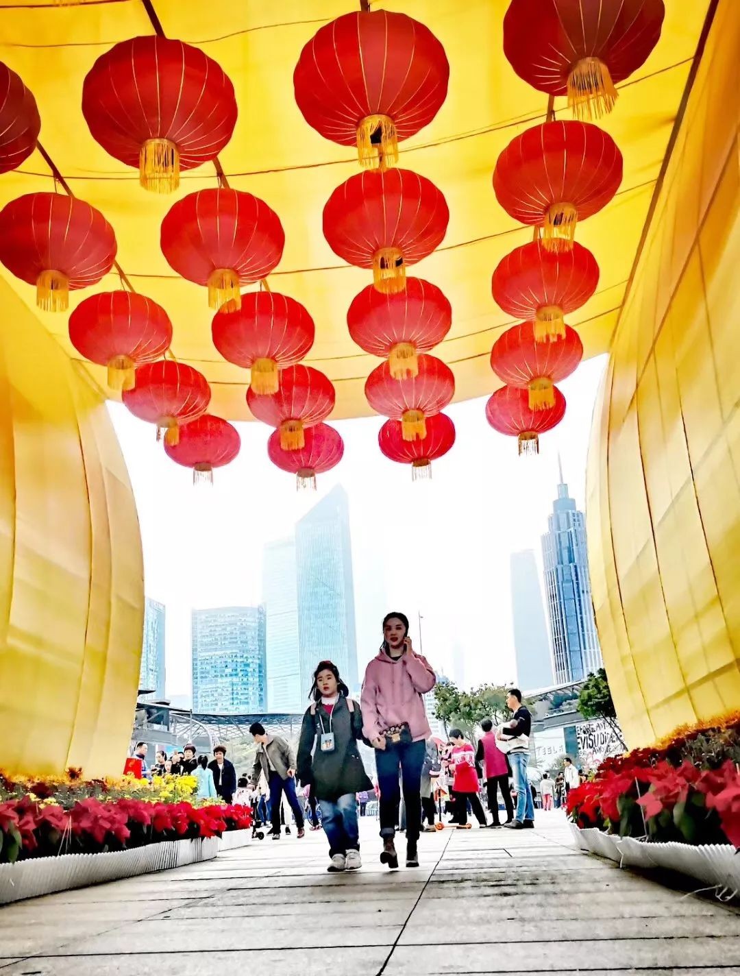 今年天河花市主题为“花开广州,醉美天河”。牌楼总跨度40米,高15米,主体外观以“天”字和“铜钱”造型为设计核心。牌楼上端采用祥云和大红灯笼造型,营造了新年吉祥如意、喜庆祥和的节日氛围。