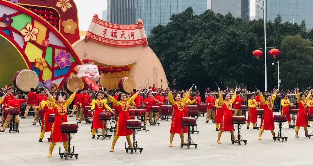 据介绍,表演团队是2018年央视春晚开场锣鼓演奏的原班人马。他们表演的鼓乐把大鼓花敲干打融入《穆桂英挂帅》、《秦王点兵》等故事中,再与岭南的粤曲舞蹈和代表天河时尚民族风的新民乐相结合,打造了一场声势浩大、热闹新颖、民俗与现代融合的百人鼓乐嘉年华。
