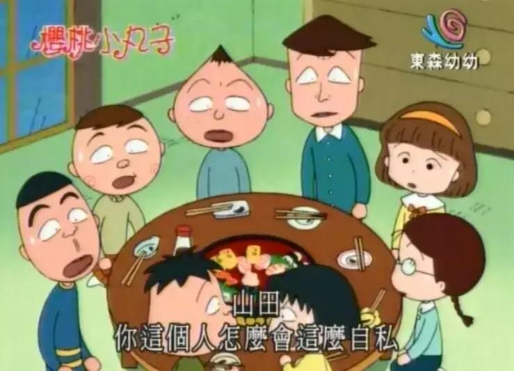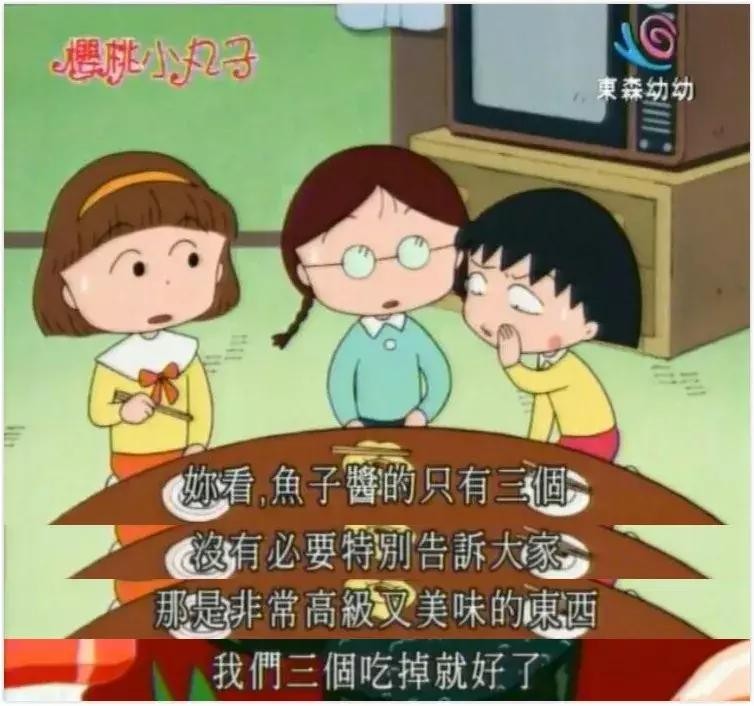 而在另一个朋友山田二话不说,夹起鱼子酱寿司一口吃掉后,小丸子反而气愤地转身批评对方“自私”。