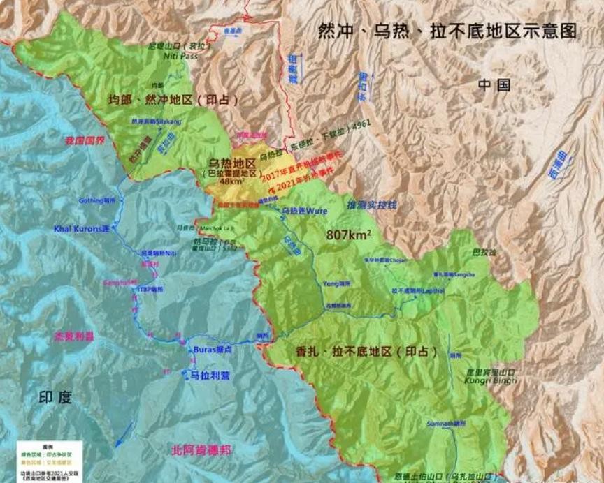 在中段,印度实际控制巨哇、曲惹、什布奇山口、桑、葱莎、波林、乌热、然冲、香扎、拉不底地区,共计2000余平方公里。桑、葱沙两地是印度从英国殖民者手中抢夺而来,香扎、拉不底、乌热、波林、什布奇山口、巨哇、曲惹等地于1954年被印军侵占。