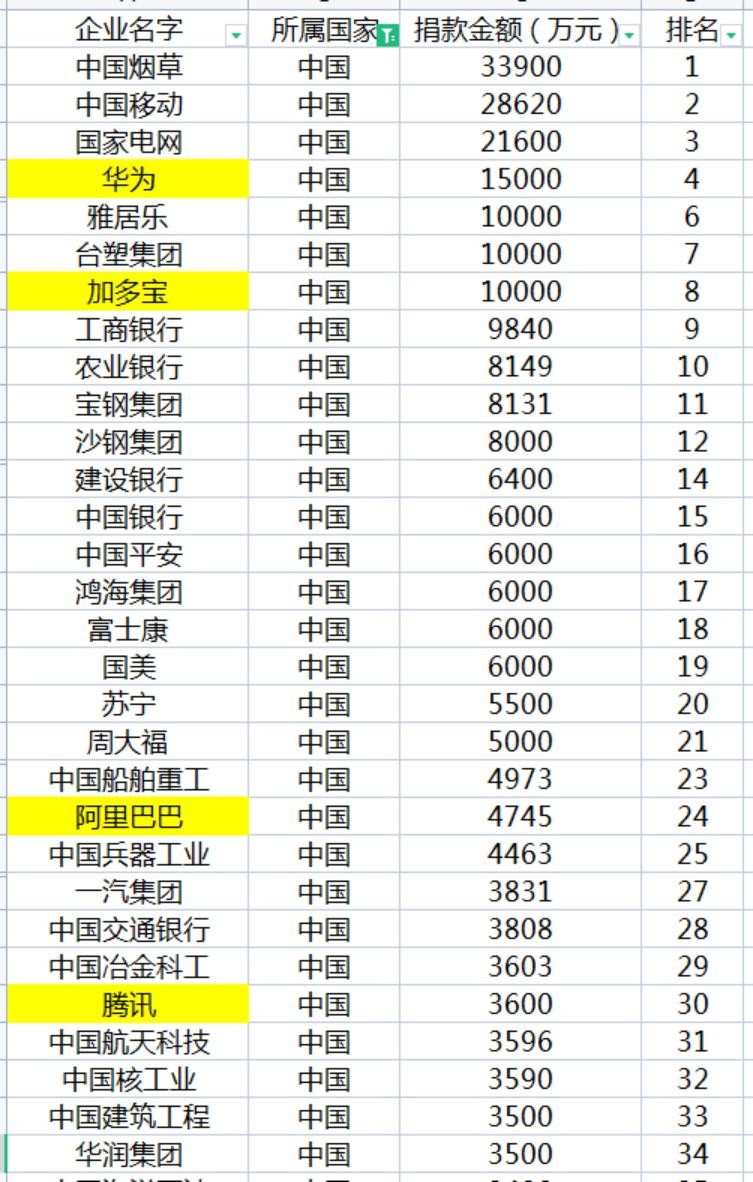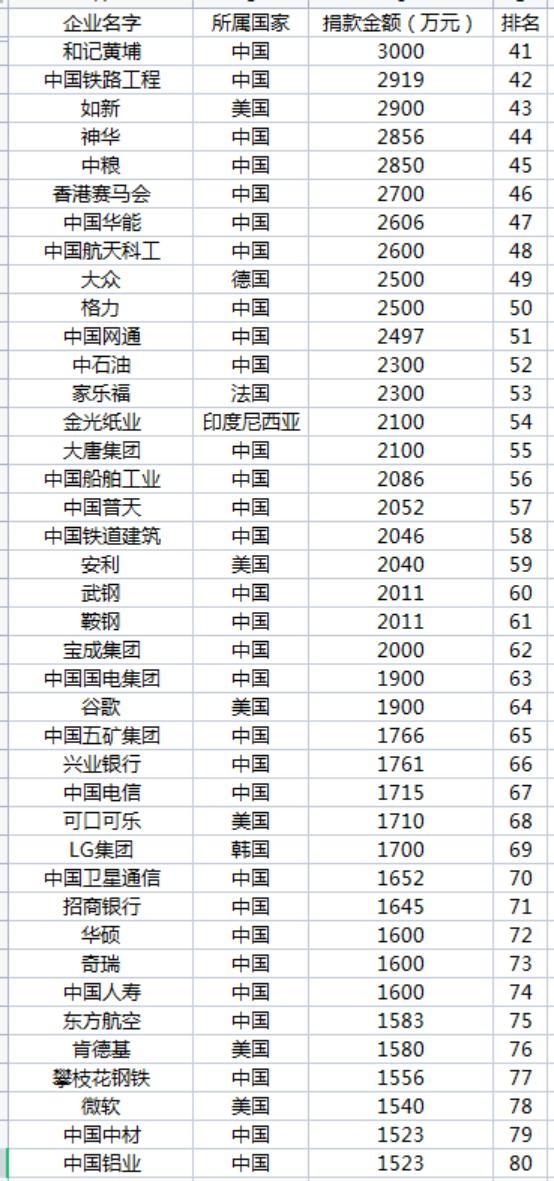 中国企业捐款前30名