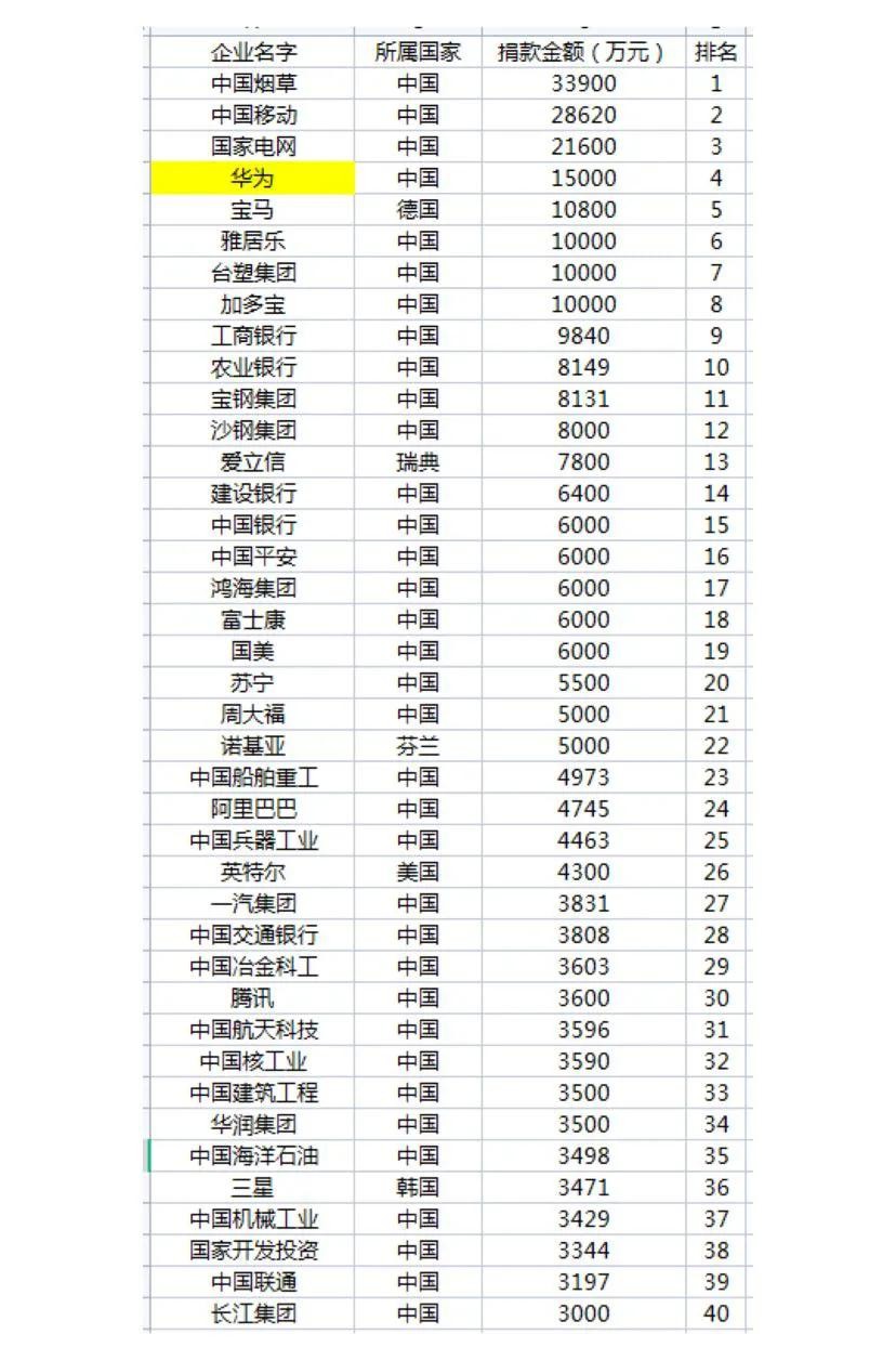 中国的企业中,我比较喜欢的有华为和加多宝,对于各个企业的捐款情况,你是怎么看呢?欢迎评论区留言。