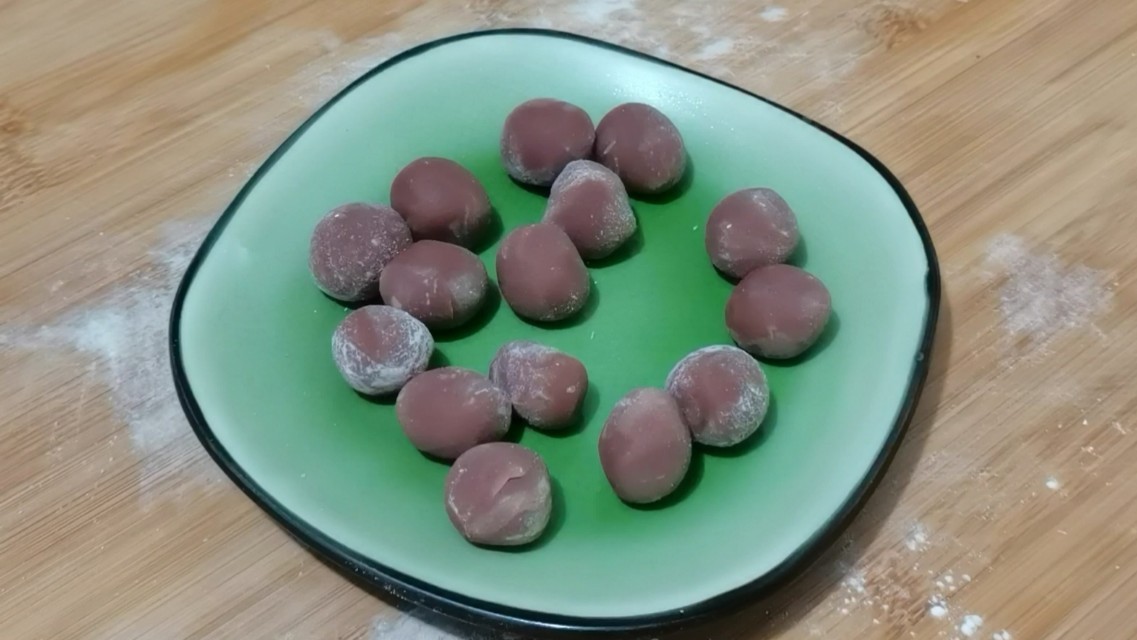 2.接下来在案子上撒上适量的干面粉,那准备好的豆沙馅裹上少许面粉,放在案子上揉搓成粗细均匀的长条,然后改刀成小剂子,再把每个剂子揉搓成小豆沙球。