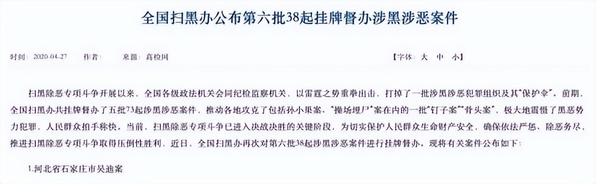 2020年4月27日,全国扫黑办对第六批38起涉黑涉恶案件进行挂牌督办,其中河北石家庄吴迪涉黑案件荣登榜首,被人们“亲切地”称为“国督一号案”。