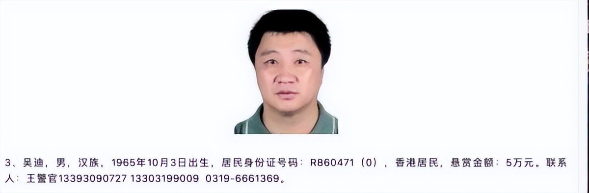 目前,河北省公安厅正公开悬赏缉捕在逃的吴迪,赏金5万元。(下图为警方公布的通报信息)