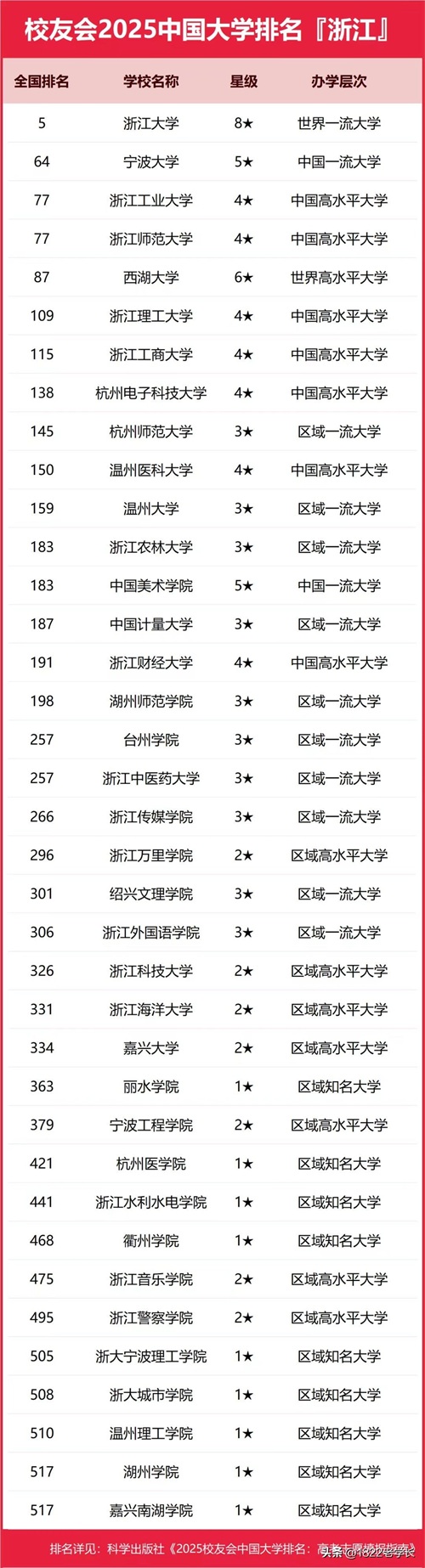 排行榜,看看即可,无须过于较真。浙江高校梯队特色比较明显,办学体系也比较丰富,尤其是有西湖大学、东方理工大学两所新型办学院校。