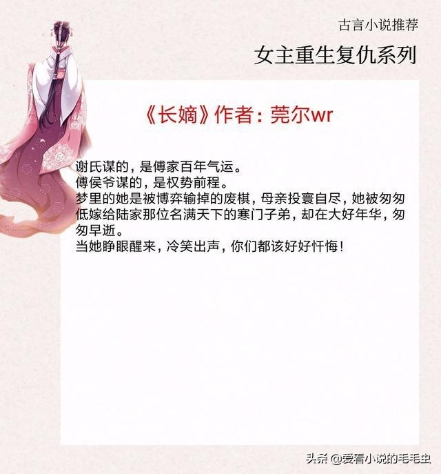 甚至皇帝也不像通常夺嫡的小说那样宠奸妃昏庸无道。皇帝死前说自己的功过待后人评说,我觉得他是明君。难得的智商都在线,真真佩服作者大大的笔力和布局了!男女主强强联手,没谁是对手啊,同样女主的性格我喜欢,就是这么强势,不堕长嫡之名!男女主还是非常幸运的,极品虽多,还是有那么几个满怀拳拳爱意的亲人支持。双方的感情挺甜的,结局圆满,强烈推荐!5本女主重生复仇古言:女主狠辣无情,一朝重生势要扭转乾坤!