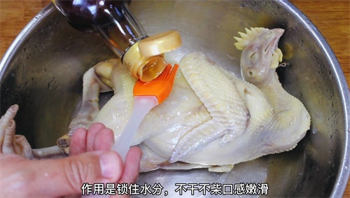6、把过冰水的鸡取出,鸡的外表刷上一层香油,自然晾干。