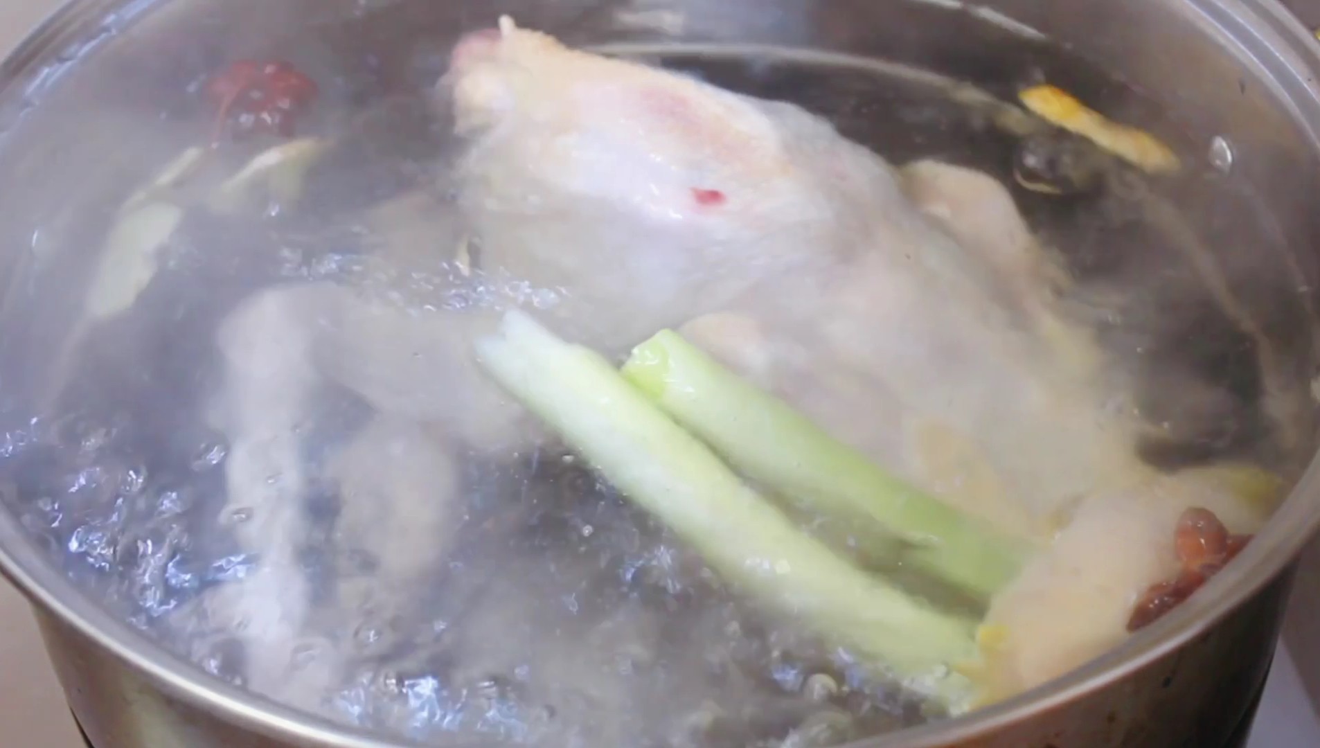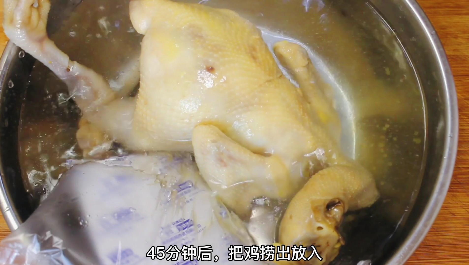 5、45分钟后把鸡取出,放入冷水里,最好是冰水里过凉。