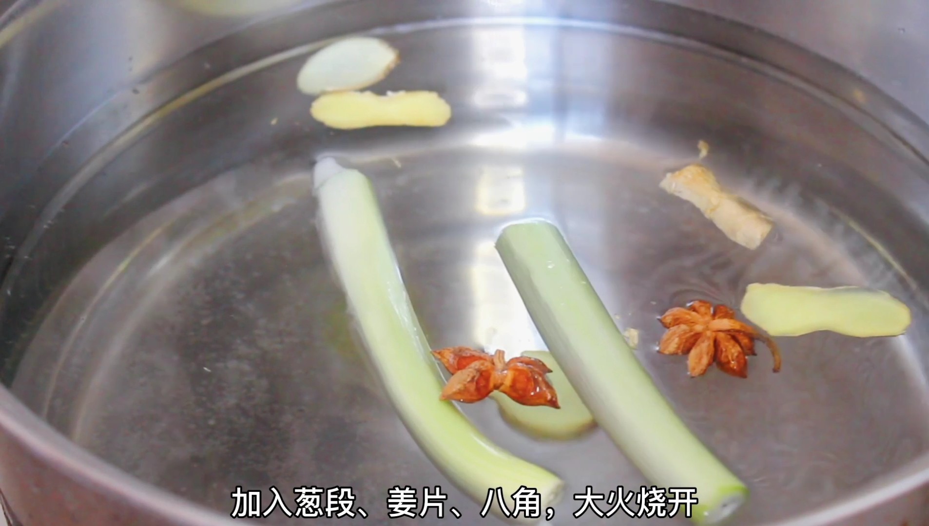 2、锅里加能足够没过鸡的水,放入葱段、姜片、八角,大火烧开。