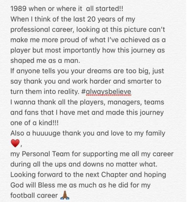 那是在1989年,一切都从这里开始。当我回顾过去20年职业生涯,再看这张照片时,作为一名球员获得的成就让我感到无比骄傲,更重要的是,这段旅程如何把我塑造成了一个男人。如果有人同你讲,你的梦想太遥远了,告诉他“谢谢”,然后加倍努力将你的梦变成现实吧。永远坚信。我想感谢我遇见的所有球员、教练、工作人员和球迷们,是你们让这段旅程更美好。另外,还要抱抱我的家人,向他们表示感谢和爱,还有我的个人团队,他们在我的整个职业生涯中都支持着我,无论高峰与低谷。很期待人生的下一章节,希望上帝能够尽可能地保佑我,就像他之前在我的职业生涯旅程中做到的一样。