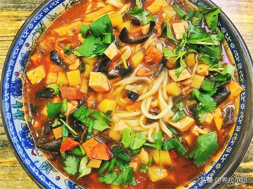 黄花、鸡蛋、猪肉、木耳、豆腐等诸多原料熬制成汤,浇在手工擀制的面条上,味道浓郁,是西北面食中的经典。