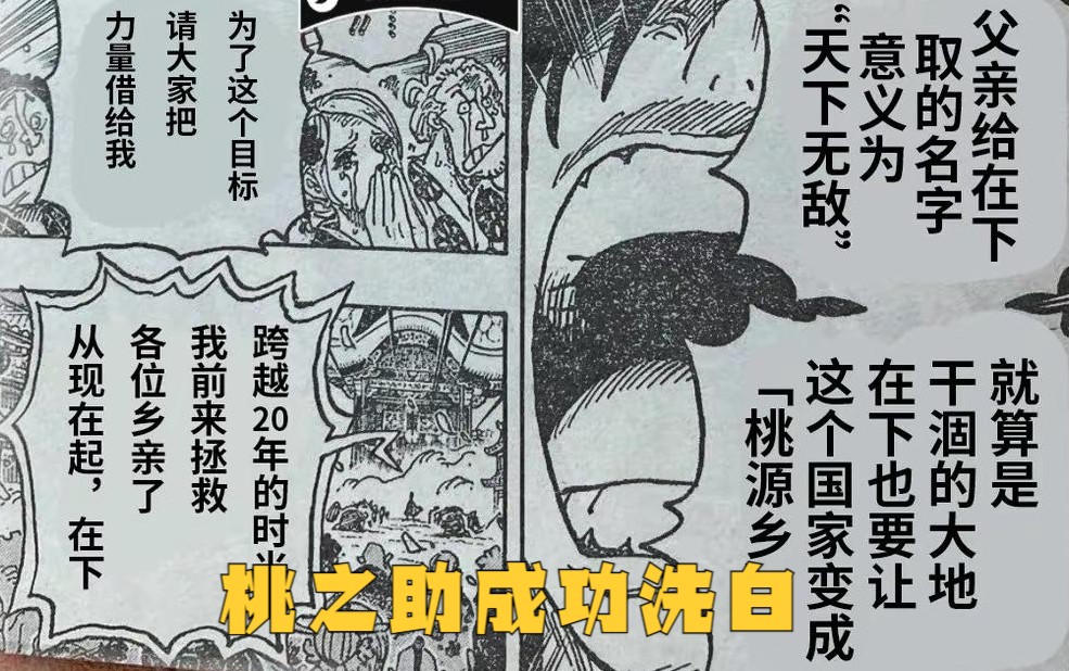 在漫画刚刚更新的1051话中,被催熟到28岁的桃之助终于是露出了他的真容。剧情中,桃之助降临花之都后给全国的百姓进行了演讲,他表示自己会拯救和之国,把和之国建设成为桃源乡,让所有的百姓都可以安居乐业。