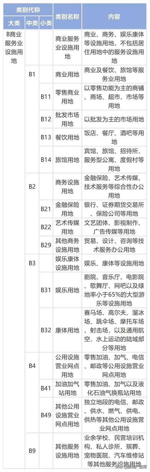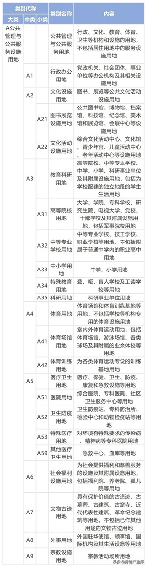 城市建设用地共分为8大类、35中类、44小类。8大类分别是:居住用地R、公共管理与公共服务设施用地A、商业服务业设施用地B、工业用地M、物流仓储用地W、道路与交通设施用地S、公用设施用地U、绿地与广场用地G。