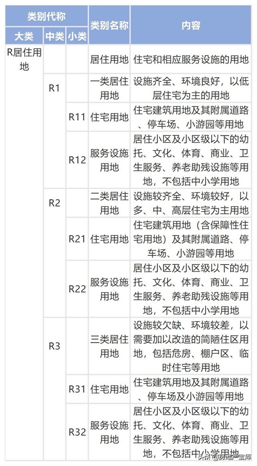 城市居住用地按照所具有的住宅质量、用地标准、各项关联设施的设置水平和完善程度,以及所处的环境条件等,分成不同标准类型用地,在我国,居住用地被分为四类: