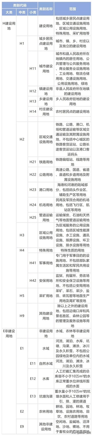 城乡用地共分为2大类,9中类,14小类。2大类分别是建设用地H与非建设用地E。
