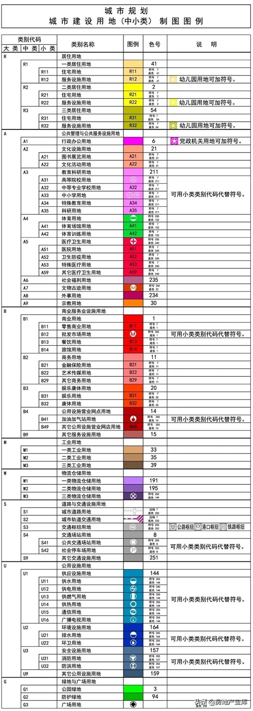 在绘制城市总体规划中的中心城区用地布局现状时,通常会依据用地分类对不同用地性质的地块加以不同的颜色,用以区分地块之间的布局。以下是城市建设用地的详细分类:
