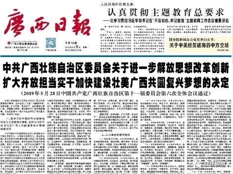 该《决定》全文上万字,在2019年5月28日中共广西壮族自治区第十一届委员会第六次全体会议通过。《决定》强调大力推进思想再解放,大力推进改革再深入,并详细列出各项改革的具体措施和时间表。