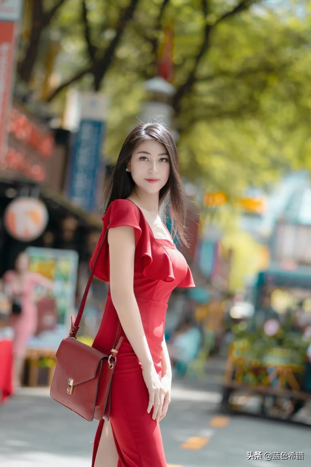 比如下面这张街景照片,穿着靓丽红裙的妹子,站在街头侧身站立,两只手自然地搭在自己的腿上。看起来时尚又大方。