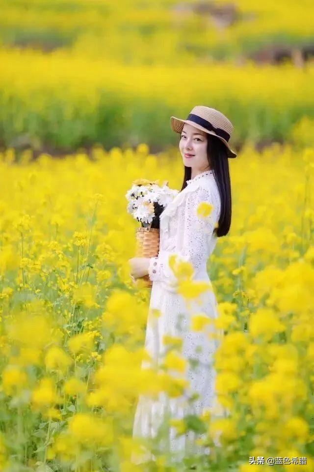 比如下图,模特侧身站在金灿灿的油菜花田中,双手捧个花篮,更具田园风情。