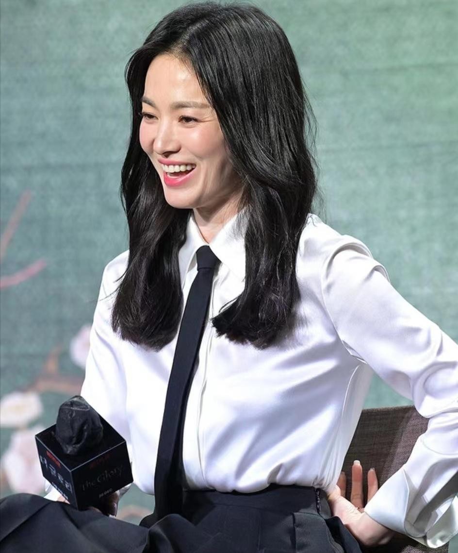 其实如果现在的她稍作打扮,一样是成熟美丽的女性。在2022年底宋慧乔出席《黑暗荣耀》的制作发表会上的照片,可以看出她虽然有皱纹,但是皮肤整体的状态还是很好,即使是四十多岁的年纪,但是保养的程度和普通人三十几岁的年纪无异。