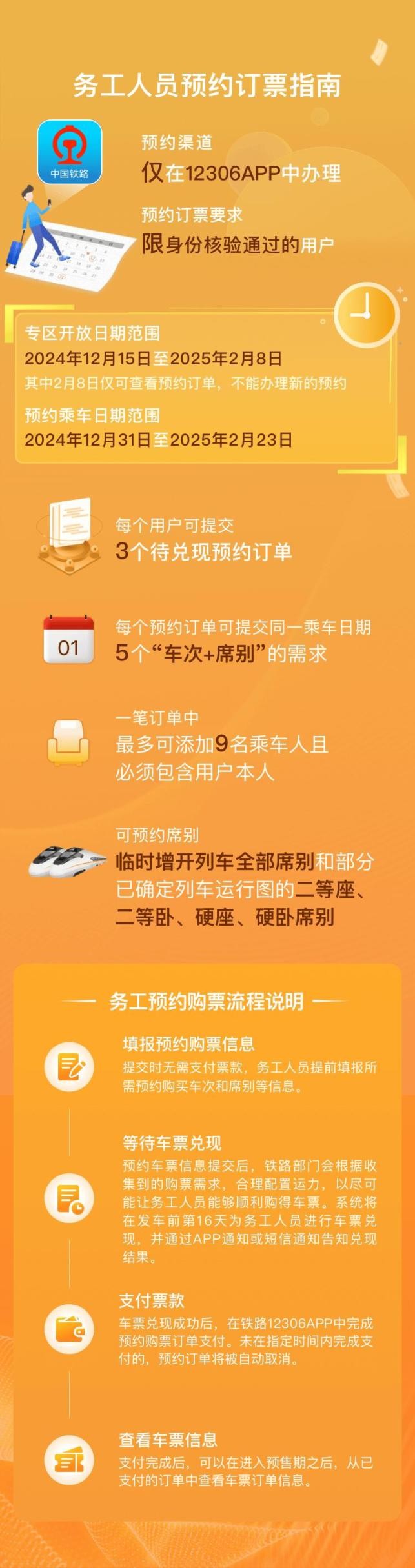 务工人员可提交开车前17天(含)以上的预约购票需求,最晚可预约2025年2月23日的车票;在开车前17天23时前在12306手机客户端提交购票需求,在开车前16天查询兑现结果,兑现成功后须在当日23时前支付票款;逾期未支付的,订单自动取消。