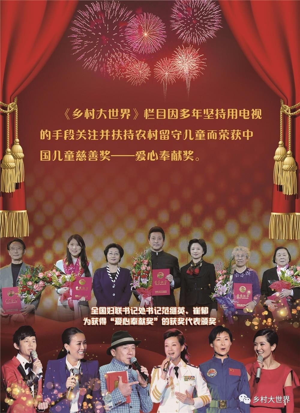 2012年底,以“综艺+公益”为核心理念的《乡村大世界》栏目还荣获了由全国妇联、中国儿童少年基金会颁发的“中国儿童慈善大奖——爱心奉献奖”。这在全国媒体业界尚属首次。