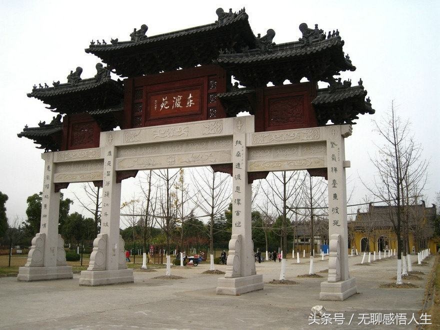 东渡苑位于塘桥镇区域二0四国道和338省道交汇处,是公元753年唐代高僧鉴真大师第六次东渡日本成功启航处,古称黄泗浦。《沙洲县志》载:“唐高僧鉴真东渡日本连续五次失败后,第六次于黄泗浦口启航东渡成功。”1963年,鉴真大师逝世1200周年纪念委员会在黄泗浦口设石质经幢一座,以志纪念。常有日本友人前来瞻仰。1994年市政府决定扩建东渡苑和鉴真东渡纪念馆。东渡苑规划面积15公顷,总投资2000万元,由东渡纪念馆、东渡桥、碑亭和经幢等建筑组成景区。全园突出水景,体现江南水乡田园风光。2001年,东渡苑一期建成。苑内主体建筑“鉴真东渡纪念馆”占地2400平方米,建筑面积1070平方米;匾额由全国政协副主席、中国佛教协会会长赵仆初题写。正殿大厅内,安放了鉴真大师铜像一尊,高2.06米,重380公斤。殿内有7幅壁画,记录鉴真大师第六次东渡日本成功的艰难行程和鉴真生平简介及东渡路线。正殿后面墙壁上挂有6块木刻书屏,内容为《东征传》节选,计1342字,记载了鉴真第六次东渡日本的经历。正殿两侧,展出了鹿苑徐家湾及许庄新石器时代遗址出土的石器、陶器、红烧土等实物,同时还展出有关鉴真的一些资料、书籍、照片及日本友人赠送的纪念品。