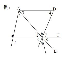 如图所示,不难看出∠1 与∠2 是同旁内角;∠1 与∠7 是同位角;∠1 与∠BAD是同旁内角;∠2 与∠6 是内错角;∠5 与∠8 对顶角.