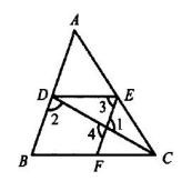 例4:如图,△ABC中,已知∠1+∠2=180°,∠3=∠B, 试判断DE与BC的位置关系,并说明理由.