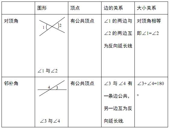两直线相交所成的四个角中存在几种不同关系的角,它们的概念及性质如下表: