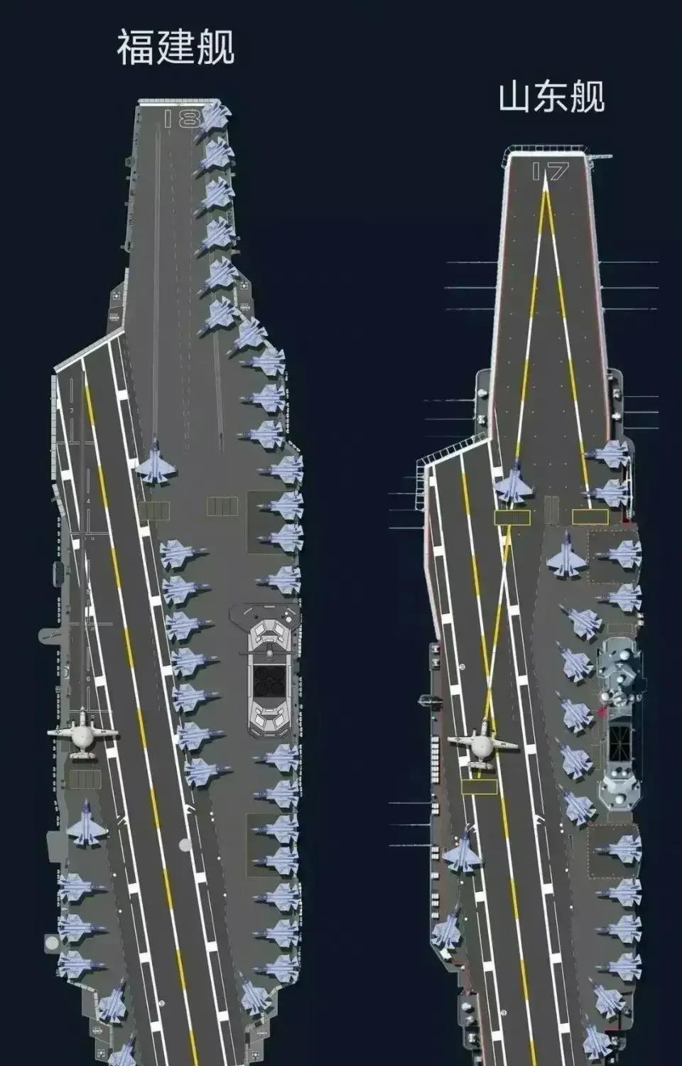 首先,就排水量而言,“福建”号的超过8万吨的满载排水量,标志着它在常规动力航母领域的最高水平。这庞大的排水量为舰载机的操作、燃料存储以及装备系统提供了充足的空间。相比之下,美国的“小鹰”级航母和英国的“伊丽莎白女王”级航母在这一方面明显不及“福建”号。