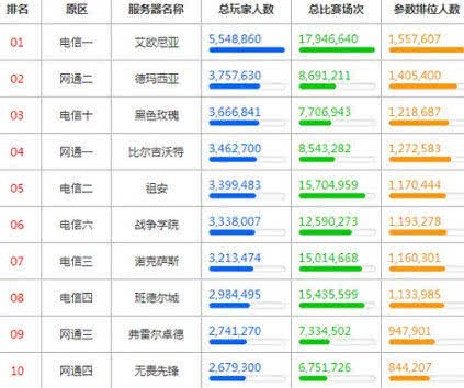 从排行榜中可以看到排在第十到第六的而分别是网通四区无畏先锋、网通三区、弗雷尔卓德、电信四区班德尔城、电信三区诺克萨斯、电信六区战争学院,从图表中也是可以看出这几个大区的总人数差距并不大,但是总比赛场数和参与排位人数,网通区要明显落后于电信区。