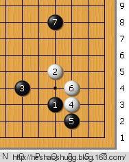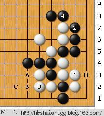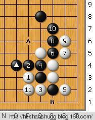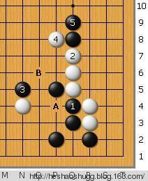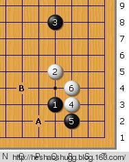 图1-3,黑5、白6必然,黑的下一手有A和B,