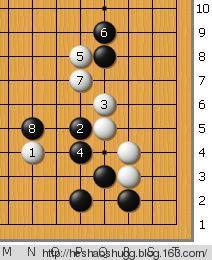 图1-22,白1扳,3虎,棋形不好,到8,黑优。