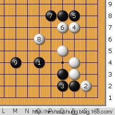 图1-7,黑1小飞,白2扳就上当了。到9,黑两面都下好了,白地有限,当然黑好。