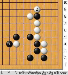 图1-4,基本图1:白4托、黑7虎以后形成的一个基本图。因为有黑二间高夹之子的存在,白无拆的余地。当然在右上角有白星位的时候,白8跳、白10逼是好点。但尽管如此,白4、6还是失去了变化,所以高手们在这种情况下往往是在8位单跳的。下面谈谈黑7和白8、白10的变化。