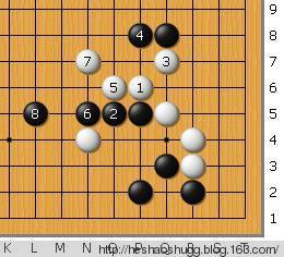图1-19,黑2靠反击正确。白3退黑4退都是正着,白5压是强手,到8,优劣难分,要看周围的配置。