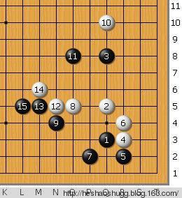 图1-15,在白▲拐的时候,黑1单跳好。白2只好穿象眼,到13,局部两分吧。得失要看配置情况。