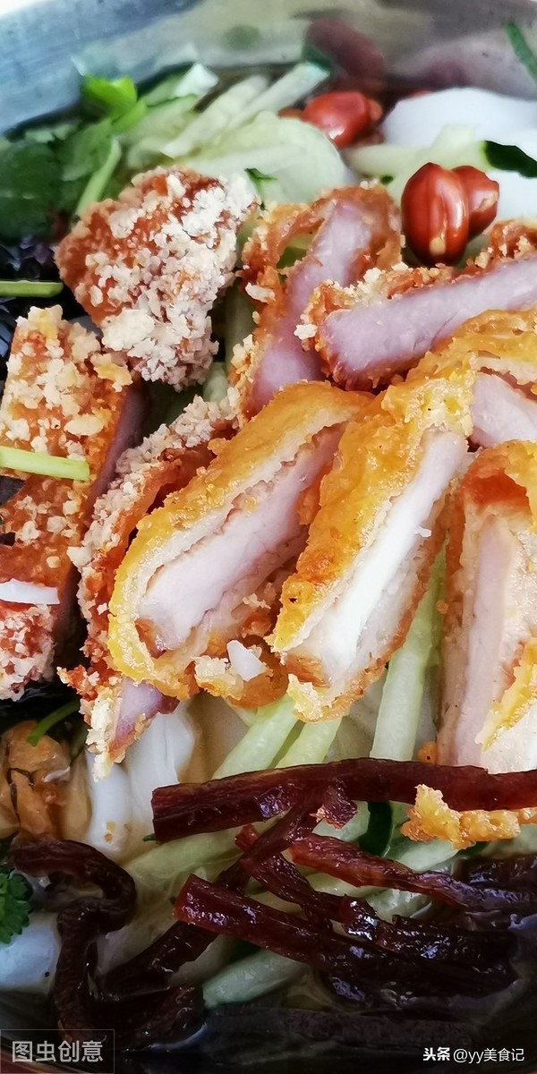 把标准的配置食材放入碗里,浇上酱汁和醋,酸粉就了。自制的酸粉,粉爽滑,腌的酸黄瓜开胃,榨过的波肉脆爽、烧肠入味回香、猪排的份量也足,浸泡在酸甜的汁里风味独特,让人回味。