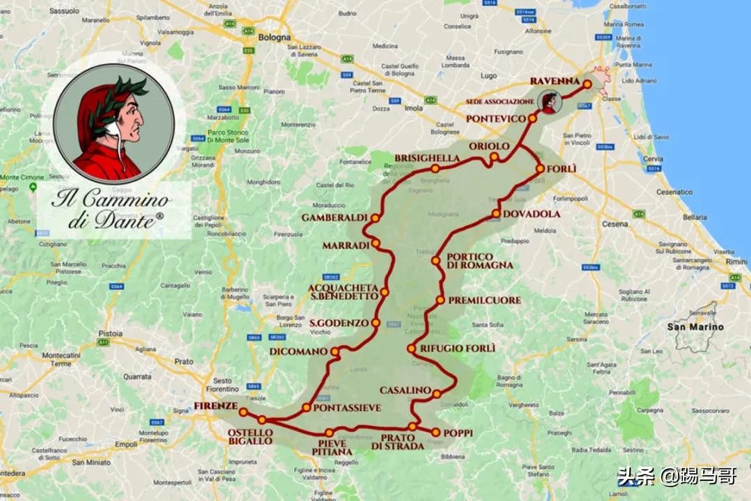 全程路线如下:拉韦纳–蓬特维科(Pontevico) - 奥里奥洛·迪·菲奇(OriolodeiFichi) –布里西盖拉(Brisighella) –甘贝拉迪(Gamberaldi) –马拉迪(Marradi) –阿尔佩的圣贝内代托(San Benedetto in Alpe)–圣戈登佐(San Godenzo) -迪科马诺(Dicomano)–蓬塔西夫(Pontassieve)–罗萨诺(Rosano) – 佛罗伦萨,部分路段至今崎岖不易行,游客可实地体会到诗人当时的艰难经历。