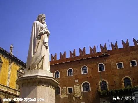 如今,但丁塑像就站在领主广场(Signori's square,也叫但丁广场)上,背对坎格兰德宫(Cangrande's palace)。广场东面有一座小教堂,门口是建于14世纪的斯卡拉家族墓地-斯卡拉拱门(ArcheScaligere),哥特式建筑物的顶部有生动漂亮的坎格兰德一世骑马塑像复制品,原物已挪到老城博物馆。这座斯卡拉拱门是哥特式建筑在维罗纳最杰出的古迹之一。