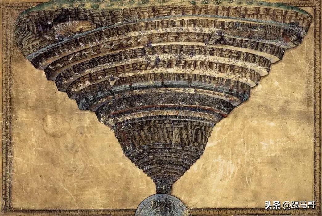 《神曲》中地狱的多圈叠落和净界、天堂的层层上升构造无疑是受此启发。