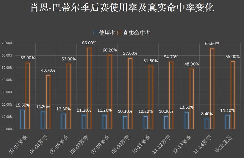 肖恩-巴蒂尔季后赛使用率及真实命中率变化(TeamAce制)