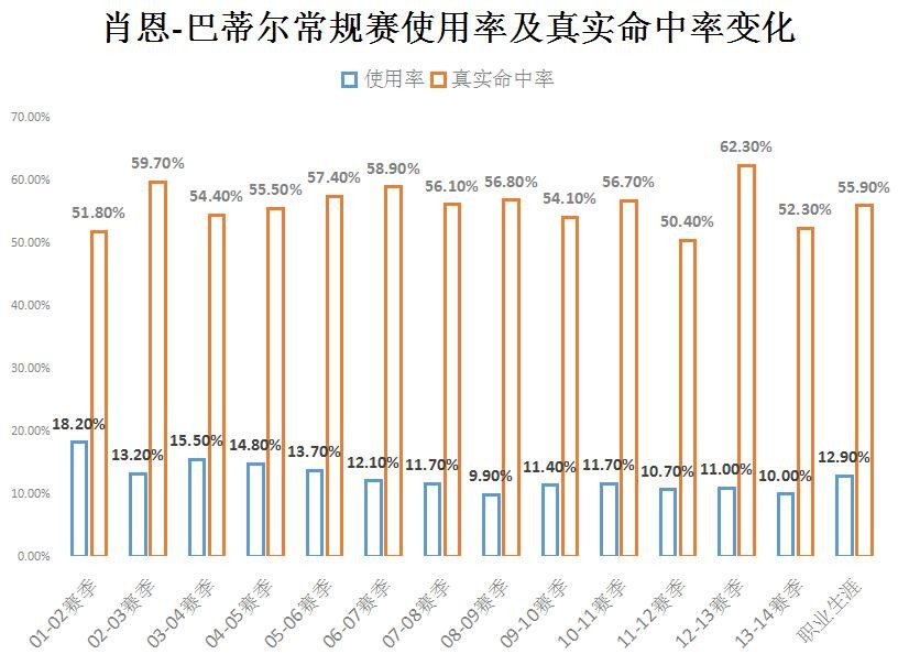 肖恩-巴蒂尔常规赛使用率及真实命中率变化(TeamAce制)