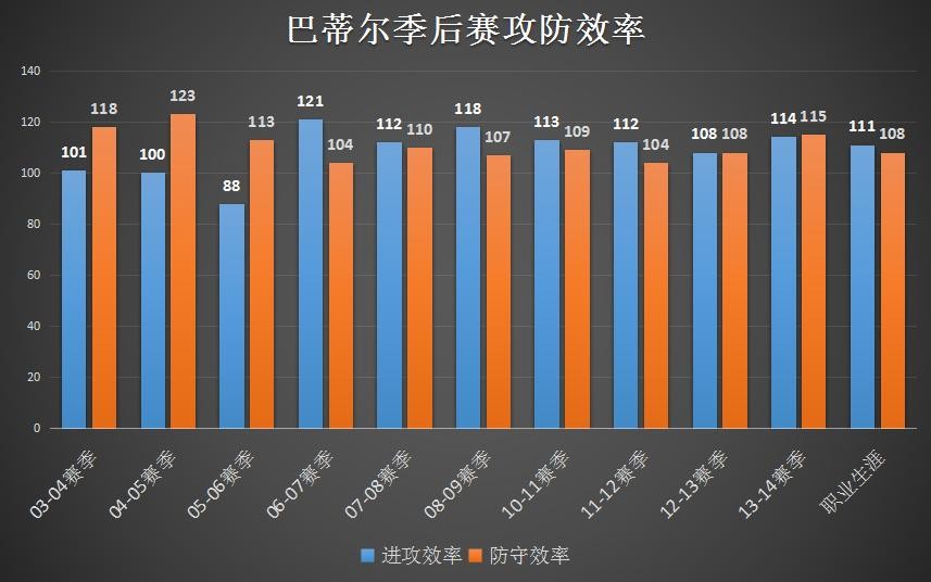巴蒂尔生涯季后赛的进攻效率为111,防守效率为108,正负差值+3。06-07赛季进攻效率121(生涯季后赛最佳),该赛季他的防守效率为104(生涯季后赛最佳,11-12赛季防守效率104),正负差值+17!