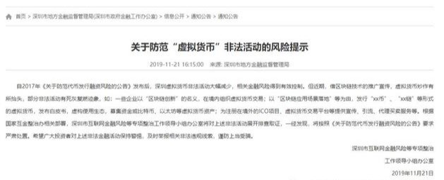 自2017年《关于防范代币发行融资风险的公告》发布后,深圳虚拟货币非法活动大幅减少,相关金融风险得到有效控制。但近期,借区块链技术的推广宣传,虚拟货币炒作有所抬头,部分非法活动有死灰复燃迹象,如:一些企业以“区块链创新”的名义,在境内组织虚拟货币交易;以“区块链应用场景落地”等为由,发行“xx币”、“xx链”等形式的虚拟货币,发布白皮书,虚构使用生态,募集资金或比特币、以太坊等虚拟货币资产;为注册在境外的ICO项目、虚拟货币交易平台等提供宣传、引流、代理买卖服务等。根据国家互金整治办相关部署,深圳市互联网金融风险等专项整治工作领导小组办公室将对上述非法活动展开排查取证,一经发现,将按照《关于防范代币发行融资风险的公告》要求严肃处置。希望广大投资者对上述非法金融活动保持警惕,及时举报相关非法违规线索,谨防上当受骗。