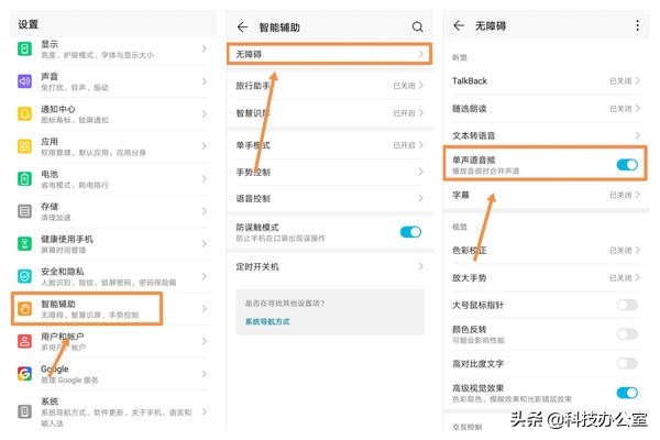 这个功能会将两个声道的音频合并成一个声道,声音自然放大。设置方法也非常的简单,找到手机“设置”,然后找到“智能辅助”,最后再把“单声道音频”打开就行了。