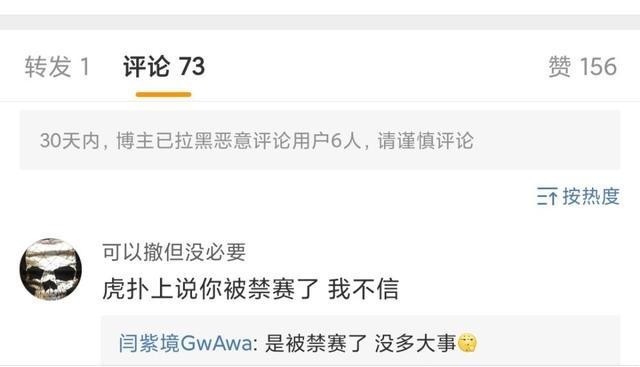 从这次的解说名单就可以看到,名单上由原来的三个人变成了两个人,而缺少的正是娃娃。很多人猜测因为娃娃喷网友,导致被禁赛。而娃娃也是在发了一个微博,而下方的网友也是询问娃娃是不是被禁赛了,而娃娃也是回复了这个消息:确实是被禁赛了,不过没事。