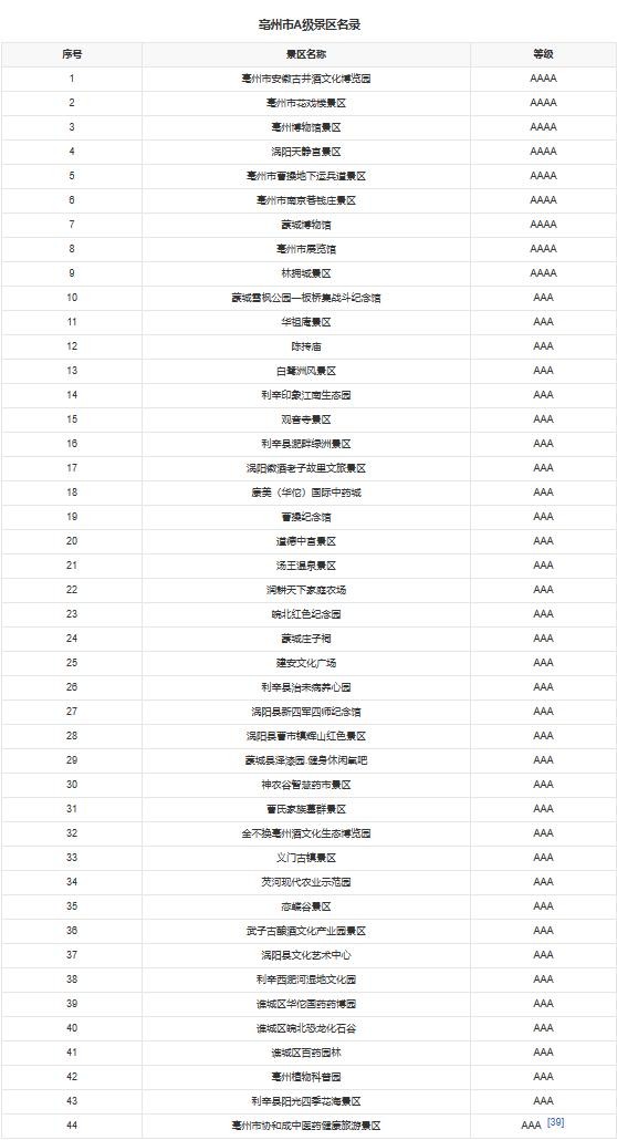 亳州市共有3A级以上旅游景区44处,其中4A级旅游景区9处;全国乡村旅游重点村2个、省级及以上中医药健康旅游基地5个、省研学旅行基地3个、省旅游商品特色街区2个、省级旅游度假区1个、省级旅游休闲街区1个、省级特色旅游名镇4个、省级特色旅游名村6个、省级休闲旅游示范点12个、AAA级旅游村庄13个。北关历史街区成功获评安徽省旅游休闲街区,汤王温泉度假区获评省级旅游度假区。神农谷中医药研学旅游基地、康美华佗国际中药城研学旅游基地、火星时代研学旅游基地、古井酒文化研学旅游基地获评安徽省研学旅游示范基地。